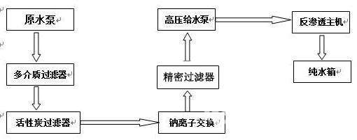 賓館純凈水設(shè)備也是采用先進(jìn)的反滲透分離技術(shù),工藝流程如下: